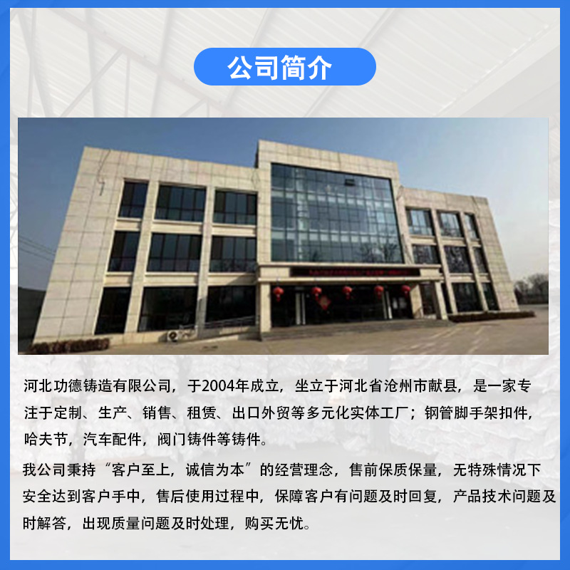 主營產(chǎn)品:國標(biāo)扣件,建筑扣件,瑪鋼扣件,鄭字牌直角扣件,鄭字牌對(duì)接扣件,鄭字牌旋轉(zhuǎn)扣件,陳字牌十字扣件、連接扣件、轉(zhuǎn)向扣件
